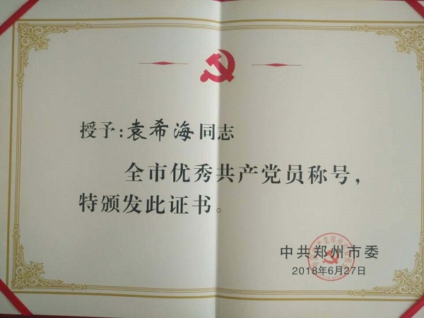 熱烈祝賀公司黨總支組織委員袁希海同志獲得“鄭州市優(yōu)秀共產(chǎn)黨員”榮譽(yù)稱(chēng)號(hào)