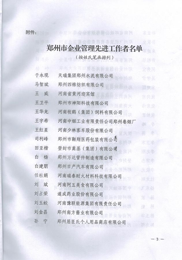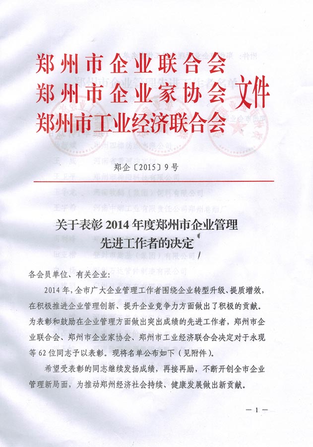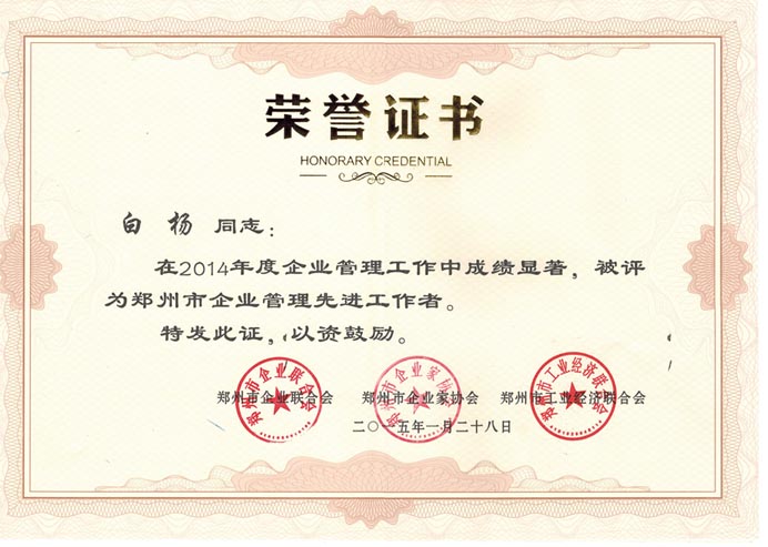 熱烈祝賀我公司白楊同志獲得鄭州市企業(yè)管理先進(jìn)工作者稱號(hào)