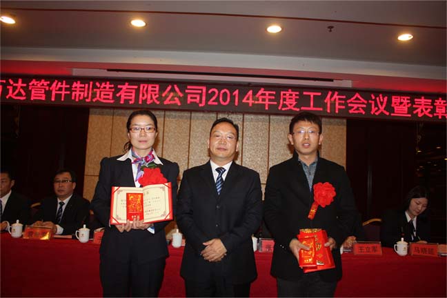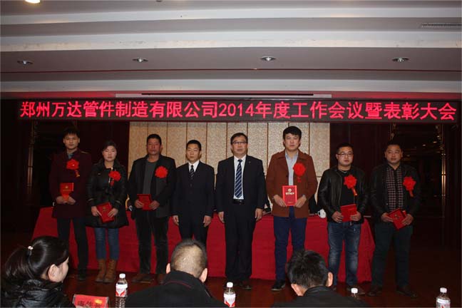 鄭州萬達管件制造有限公司2014年年會于2015年1月20日隆重召開。會議首先表彰了公司2014年度先進工作者、先進部門及班組、優(yōu)秀干部、年度進步之星、銷售冠軍、優(yōu)秀黨員等十余個獎項,并對獲獎?wù)哳C發(fā)了獎金和證書。公司董事長、黨委書記何清同志在會議上做了題為《適應(yīng)新常態(tài) 開創(chuàng)新局面 實現(xiàn)公司持續(xù)健康穩(wěn)定發(fā)展 》的報告,總結(jié)了2014年公司的發(fā)展歷程,取得的成績和不足,展望和部署2015年公司發(fā)展的目標和重點工作,為公司全力建設(shè)五位一體的萬達事業(yè)指明了努力方向。公司全體人員中午舉行了盛大的團拜招待會,歡聚一堂,其樂融融。