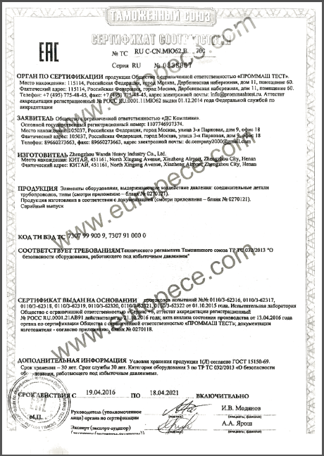 2016年4月20日,鄭州萬達重工股份有限公司順利通過海關聯(lián)盟“CU-TR”認證,并獲得由“SERCONS”機構頒發(fā)的證書。