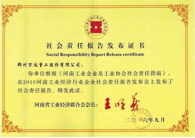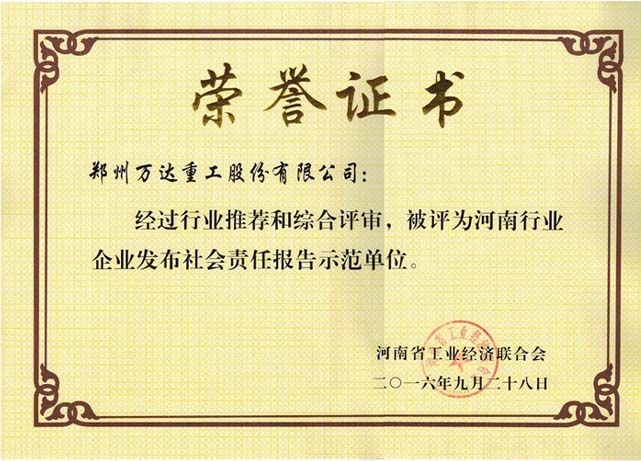 熱烈祝賀鄭州萬達重工股份有限公司獲得“河南行業(yè)企業(yè)發(fā)布社會責任報告示范單位”榮譽稱