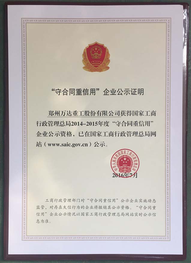 熱烈祝賀鄭州萬達(dá)重工股份有限公司榮獲2014-2015年度“國家守合同重信用”企業(yè)