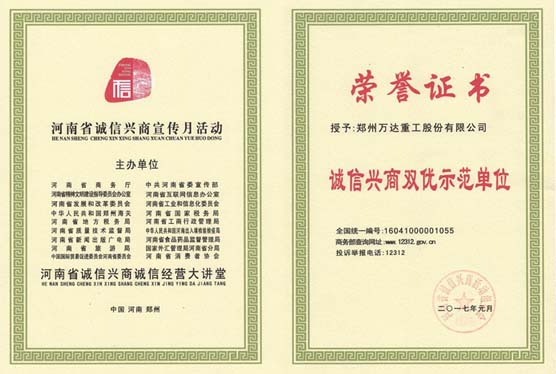 熱烈祝賀鄭州萬(wàn)達(dá)重工股份有限公司及公司董事長(zhǎng)、書(shū)記何清先生獲的“誠(chéng)信興商雙優(yōu)示范單