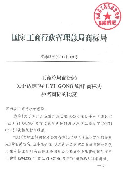 根據(jù)國家工商行政管理總局商標(biāo)局下發(fā)的商標(biāo)馳字【2017】108號《工商總局商標(biāo)局關(guān)于認(rèn)定“益工 YI GONG及圖”商標(biāo)為馳名商標(biāo)的批復(fù)》文件,公司使用在商標(biāo)注冊用商品和服務(wù)國際分類第6類金屬管道配件商品上的“第1594235號益工YI GONG及圖”商品被認(rèn)定為中國馳名商標(biāo)”,這不僅是公司商標(biāo)保護(hù)的重大成果,也實(shí)現(xiàn)了鄭州航空港經(jīng)濟(jì)綜合實(shí)驗(yàn)區(qū)馳名商標(biāo)零的突破。