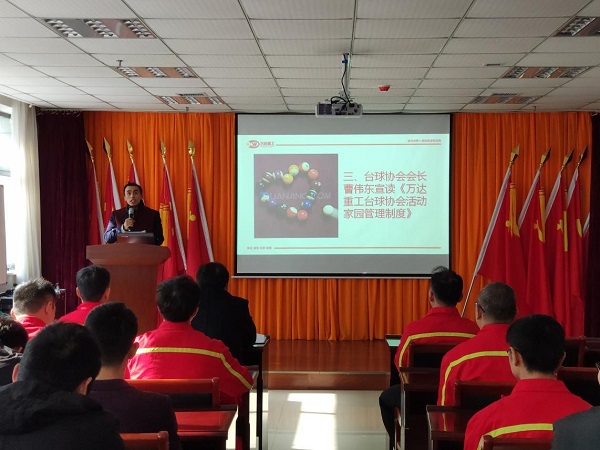 會(huì)議由宣傳部文化專員王越強(qiáng)主持。首先臺(tái)球協(xié)會(huì)會(huì)員代表翟李憲發(fā)言,對(duì)公司工會(huì)給臺(tái)球協(xié)會(huì)提供專業(yè)的活動(dòng)場地表示感謝,倡議全體會(huì)員積極參加協(xié)會(huì)活動(dòng),共同把協(xié)會(huì)辦好。接著,臺(tái)球協(xié)會(huì)委員代表王欣發(fā)言,講述了臺(tái)球的發(fā)展歷史,并代表臺(tái)球協(xié)會(huì)委員會(huì)表態(tài)一定會(huì)為廣大會(huì)員服務(wù)好,將臺(tái)球協(xié)會(huì)建設(shè)成為萬達(dá)重工協(xié)會(huì)的標(biāo)桿,為其他協(xié)會(huì)的成立探索新的思路。然后臺(tái)球協(xié)會(huì)會(huì)長曹偉東宣讀《萬達(dá)重工臺(tái)球協(xié)會(huì)活動(dòng)家園管理制度》,要求廣大會(huì)員按照制度使用臺(tái)球室的設(shè)施。遵守《萬達(dá)重工臺(tái)球協(xié)會(huì)章程》,并表態(tài)一定要管理好協(xié)會(huì),為會(huì)員開展活動(dòng)做好組織、策劃。公司財(cái)務(wù)總監(jiān)劉保國代表公司發(fā)表賀詞,并承諾在今后的協(xié)會(huì)發(fā)展中,積極支持協(xié)會(huì)工作,同時(shí)希望臺(tái)球協(xié)會(huì)在發(fā)展過程中辦出特色,辦出風(fēng)格,辦出水平。