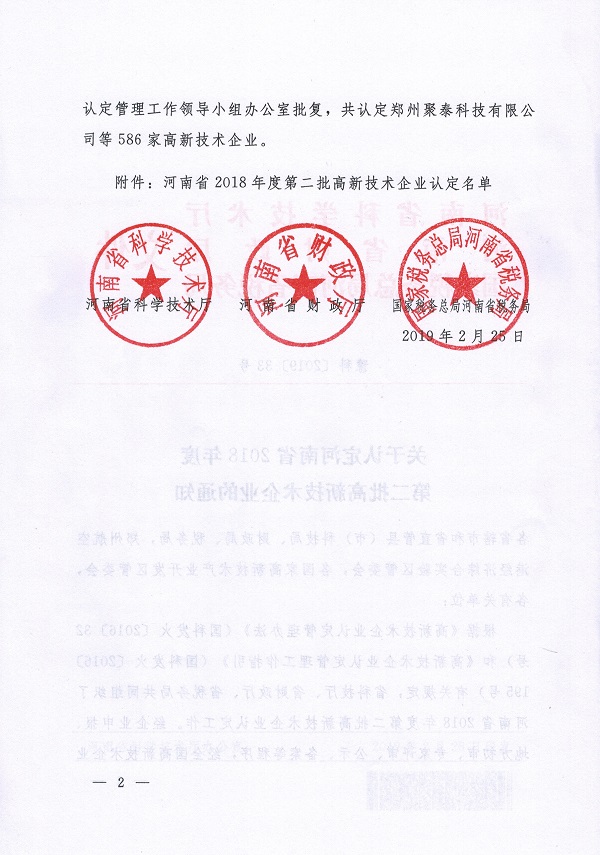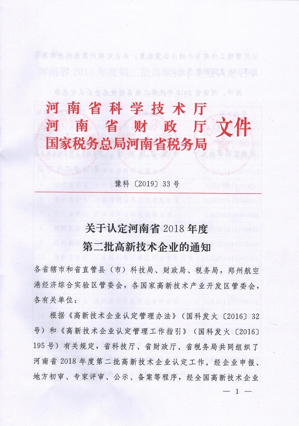 鄭州萬(wàn)達(dá)重工股份有限公司通過(guò)了由省科技廳、省財(cái)政廳、省稅務(wù)局共同組織的河南省2018年度第二批高新技術(shù)企業(yè)認(rèn)定,榮獲“高新技術(shù)企業(yè)”稱號(hào)。