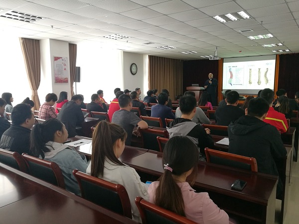 4月29日中午,針對公司生產(chǎn)崗位員工工作站立時間長等特點,王剛老師專門為員工講授了一套健身鍛煉方法,使大家隨時隨地都能夠進行練習鍛煉;4月30日,針對公司行政類崗位員工久坐、低頭伏案等特點,王剛老師精心為大家講解了頸椎病、腰肌勞損、不良睡坐姿等因素使員工產(chǎn)生身體疾病及如何預防和調(diào)理的健康知識講座,并通過現(xiàn)場教學指導等方式,為大家上了一堂生動的健康管理和綜合調(diào)理健康講座。通過面對面地交流及傳授,讓廣大員工更透徹地領會了相關疾病的預防和保健,以及健康的行為和生活方式。