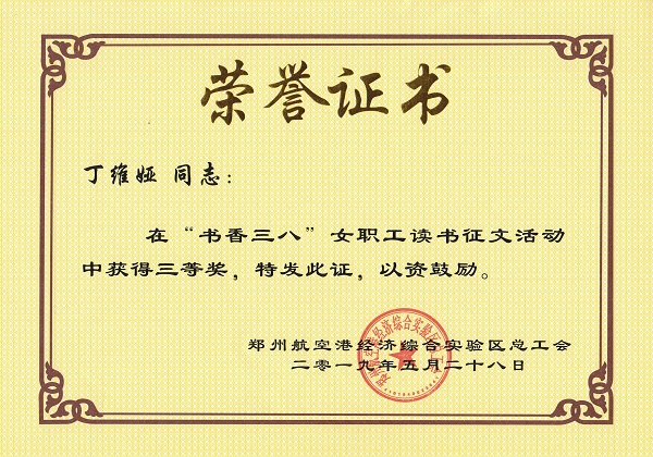 5月28日,鄭州航空港經(jīng)濟綜合試驗區(qū)總工會下發(fā)表彰通知,在全區(qū)女職工中開展的“逐夢新時代·巾幗綻芳華”為主題的“書香三八”女職工讀書征文活動中,我公司員工丁維婭的作品獲得三等獎,并下發(fā)榮譽證書及鄭州市新華書店購書卡以資鼓勵。