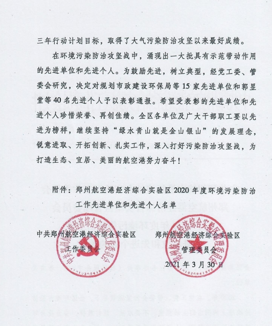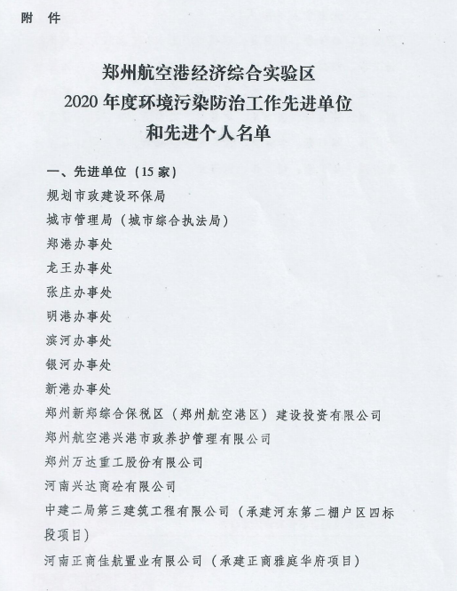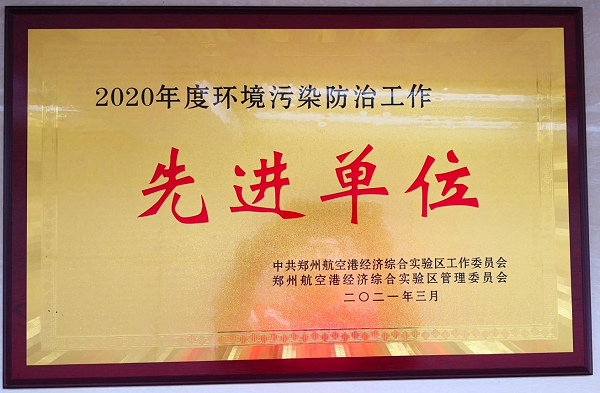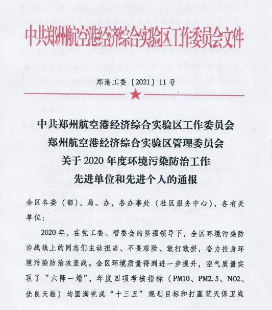 鄭州萬達重工股份有限公司榮獲鄭州航空港經(jīng)濟綜合實驗區(qū)2020年度環(huán)境污染防治工作先進單位
